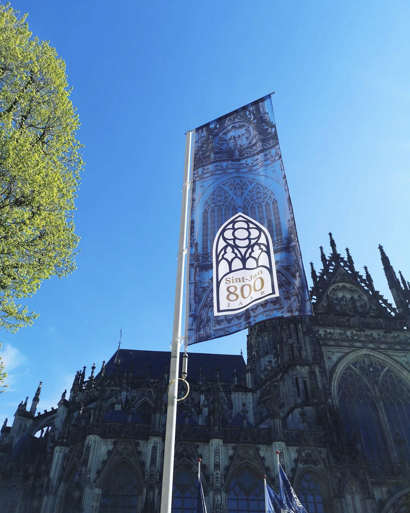 Voor het 800-jarig jubileum van de Sint-Jan ontwierpen we het jubileumlogo en produceerden we een serie banieren en doeken die het feestjaar zichtbaar maakten in én rondom de kathedraal.