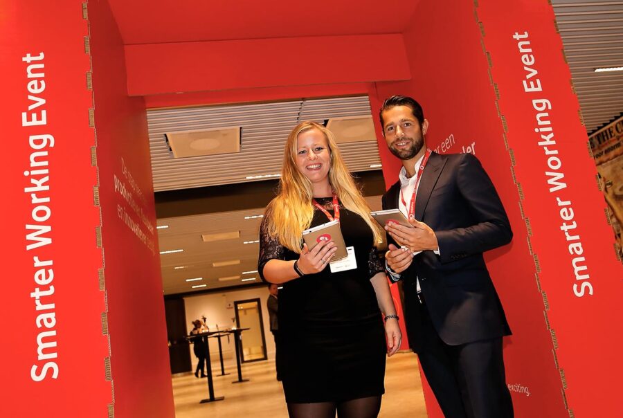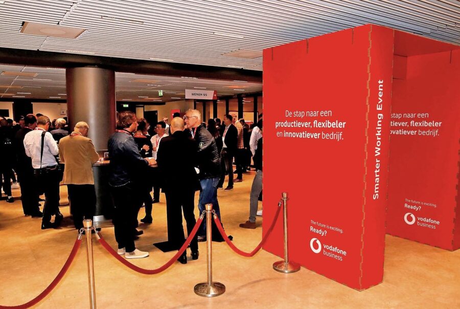 In opdracht van De Persgroep realiseerden we voor de Smarter Working Events van Vodafone verschillende objecten van honingraat karton. Denk aan een indrukwekkende entreepoort, tafelbordjes en grote kubussen voor op het podium.