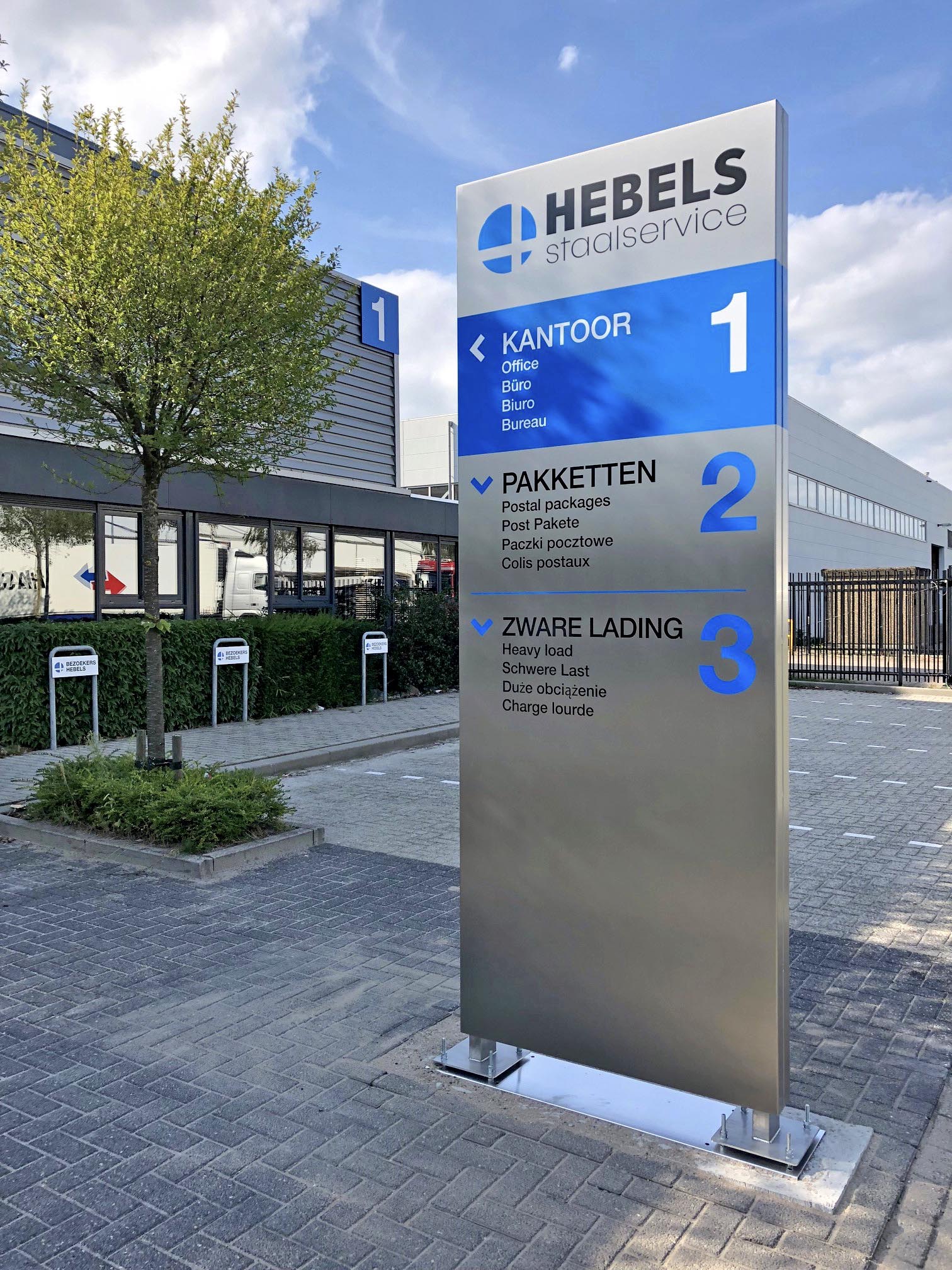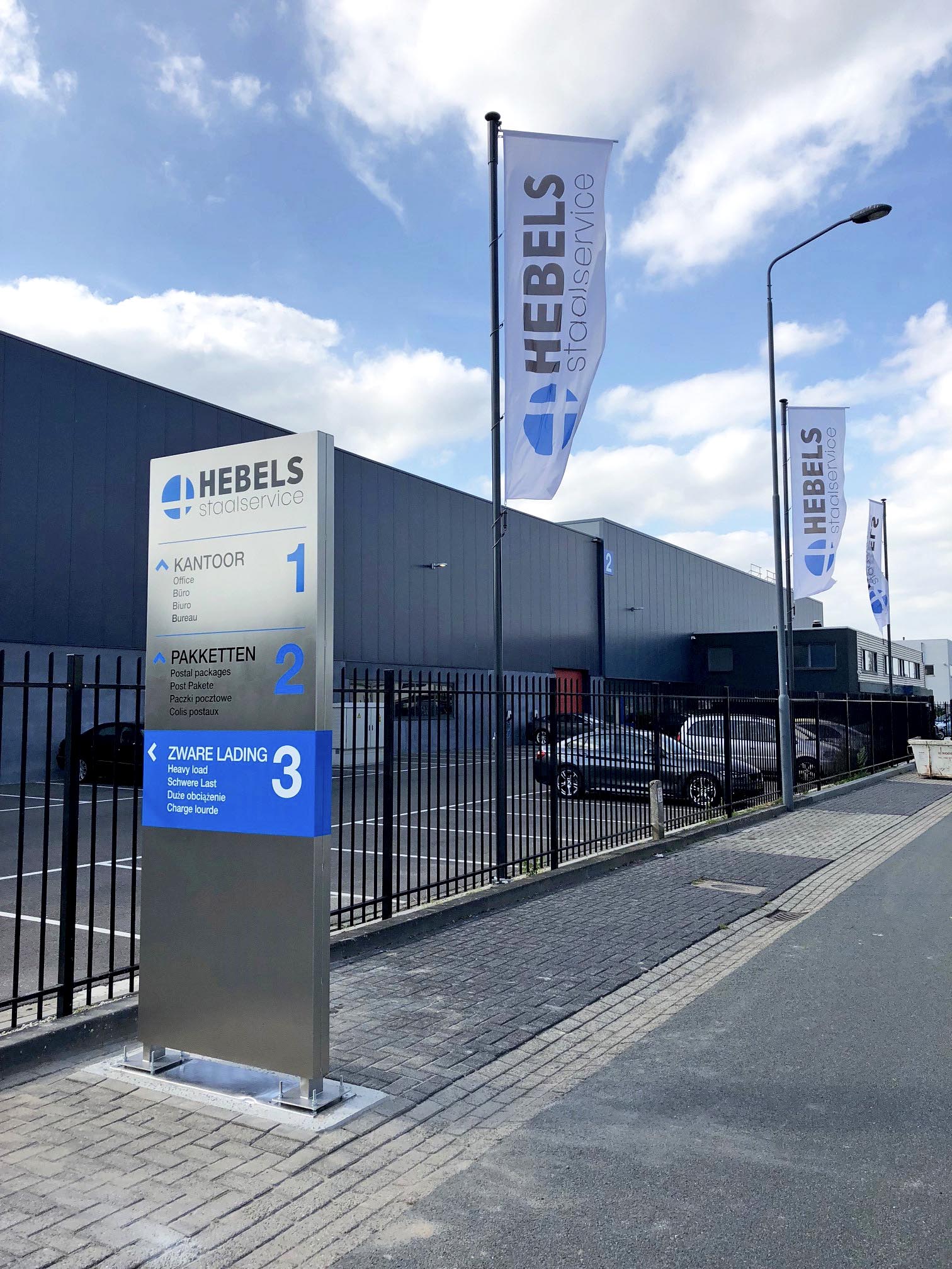 Voor Hebels Staalservice realiseerde Kleefkracht de complete buitenbewegwijzering van het terrein. Leveranciers wisten niet altijd waar ze moesten zijn, waardoor er behoefte was aan een duidelijk en overzichtelijk bewegwijzeringsplan. Wij werden gevraagd om mee te denken over een oplossing die zowel functioneel als representatief is.