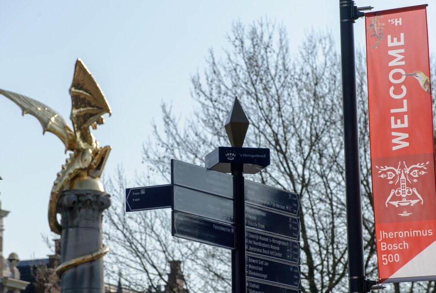 Tijdens het 500ste sterfjaar van ’s-Hertogenbosch’ bekendste schilder, Jheronimus Bosch, mocht Kleefkracht de stad visueel aankleden. Een grootschalig city dressing-project waarin alles samenkwam: banieren, banners, hekdoeken, bedrukte poorten, wandelroutes en indrukwekkende drieluiken.