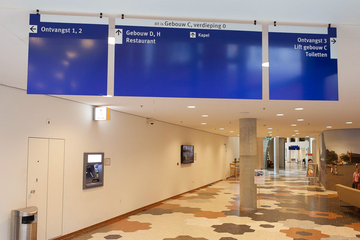 In een ziekenhuis is goede interne routing nog belangrijker. Zonder zoeken aankomen op de juiste afdeling geeft vertrouwen en voorkomt onnodige stress. Voor het Jeroen Bosch Ziekenhuis verzorgt Kleefkracht de complete bewegwijzering: van vormgeving en productie tot montage op locatie.